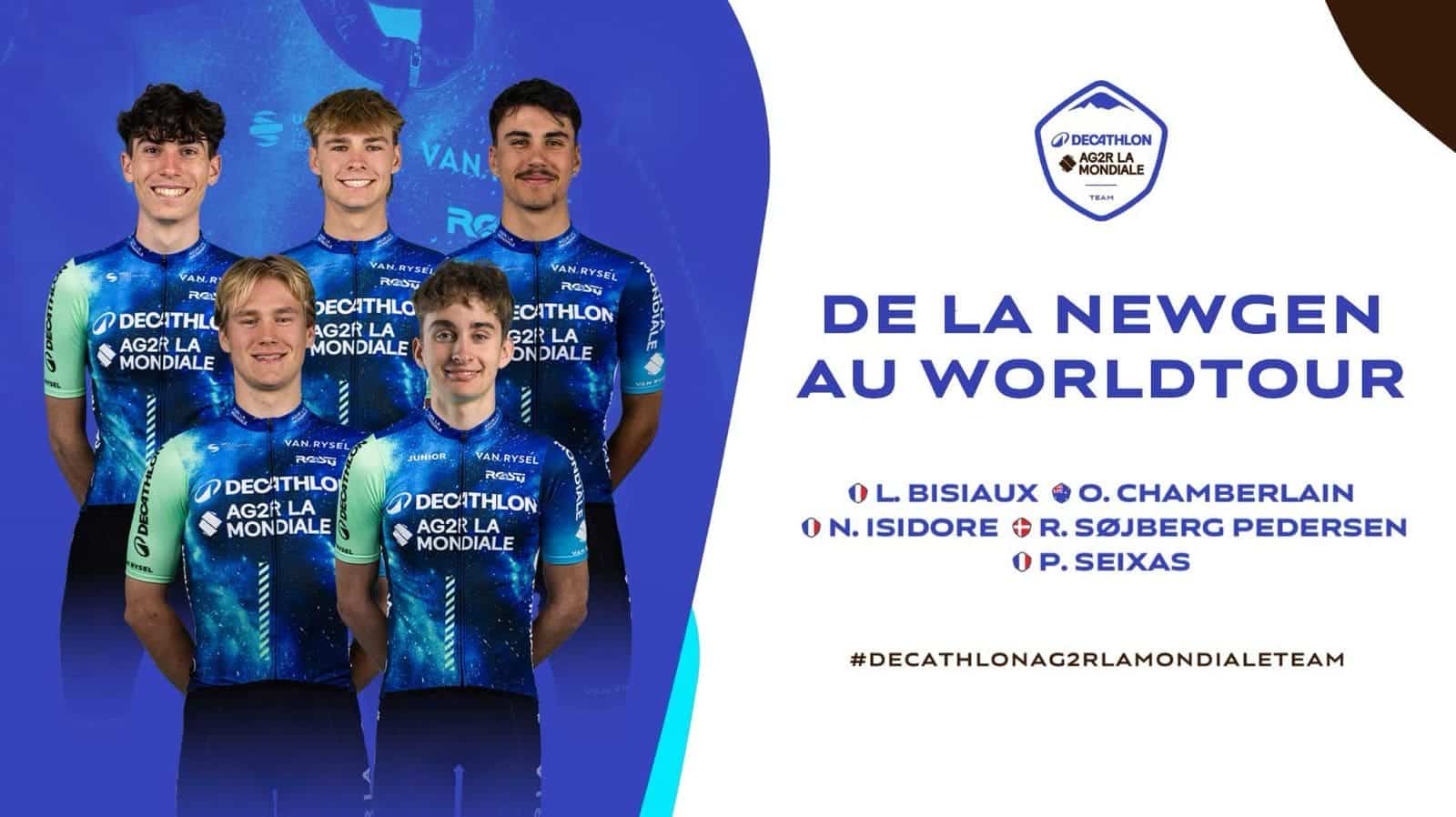 La saison 2025 va venir concrétiser la stratégie de filière de formation avec l’intégration de 5 jeunes coureurs de la NewGen DECATHLON AG2R LA MONDIALE qui rejoindront la WorldTour dès l’an prochain :