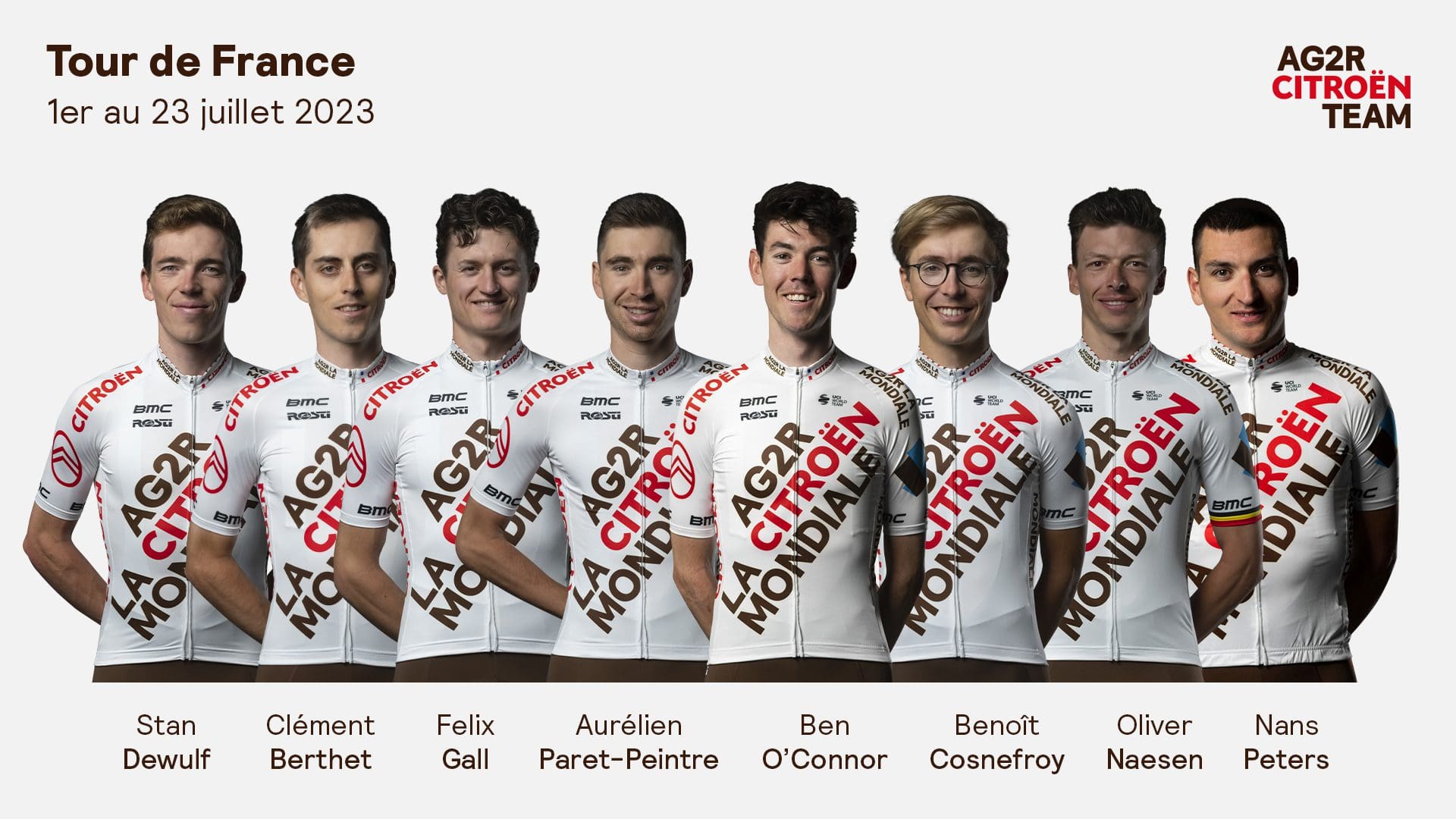 Trois grimpeurs seront autour de lui pour l’épauler en montagne et nous savons que ses équipiers pourront le guider notamment dans les plaines. Évidemment, une victoire d’étape sera aussi l’un de nos objectifs. Notre équipe est compétitive et homogène pour performer sur la plus grande course du monde. Il nous faudra être très attentif dès le Grand départ de cette 110e édition au Pays basque avant de retrouver la montagne, notre plus grand terrain d’expression. Nous aurons le privilège de rouler durant six jours sur les routes des Alpes que nous aimons tant. Ce sera forcément un moment particulier pour toute l’équipe AG2R CITROËN. Nous avons à cœur de briller devant nos supporters. »